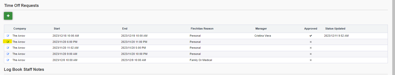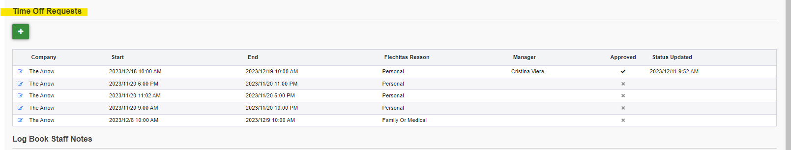 Or, if you wish to add a new time off request, you'll click the green plus button located right below the Time Off Requests title/section: