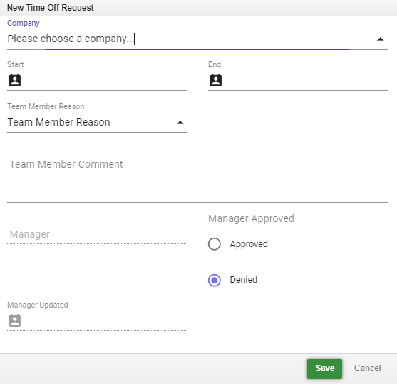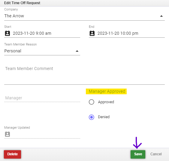 8. Reviewing/Entering the Time Off Request: For an existing time off request, you'll choose whether to approve or deny the time-off request under the Manager Approved section, and you'll click Save once you've made your selection: